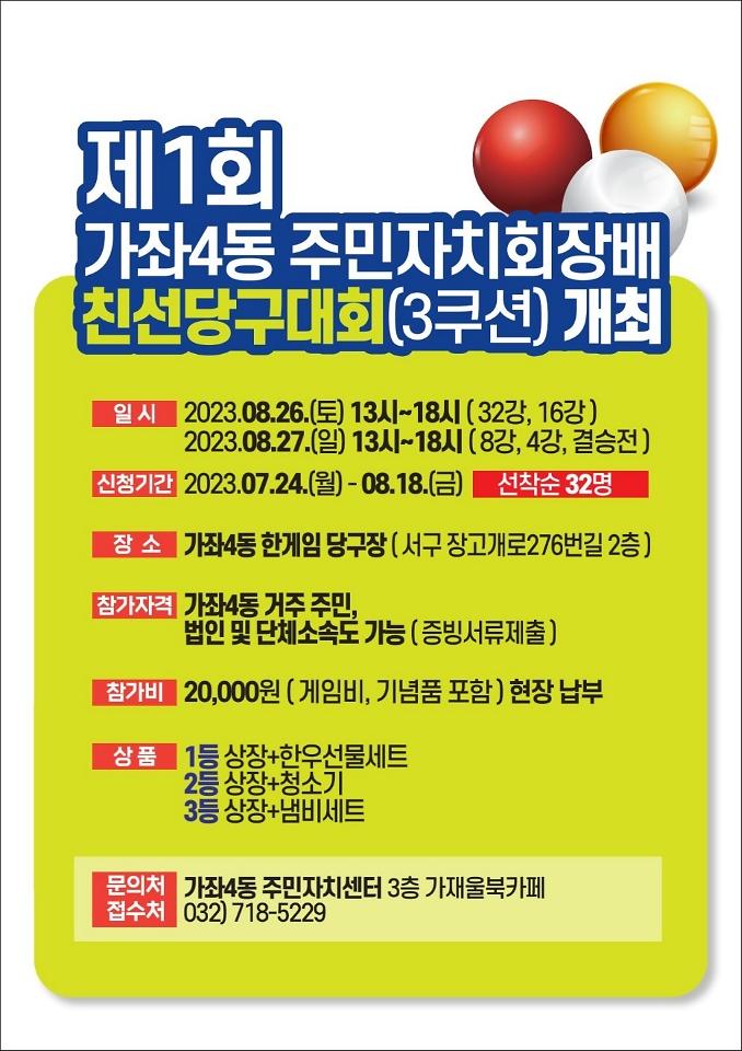 가좌4동 주민자치회에서 지역 주민분들과의 소통과 화합을 위한 자리로 '가좌4동 제1회 주민자치회장배 친선스포츠(당구) 대회'를 개최하고자 합니다. 지역주민분들의 많은 관심과 참여 바랍니다. 감사합니다.