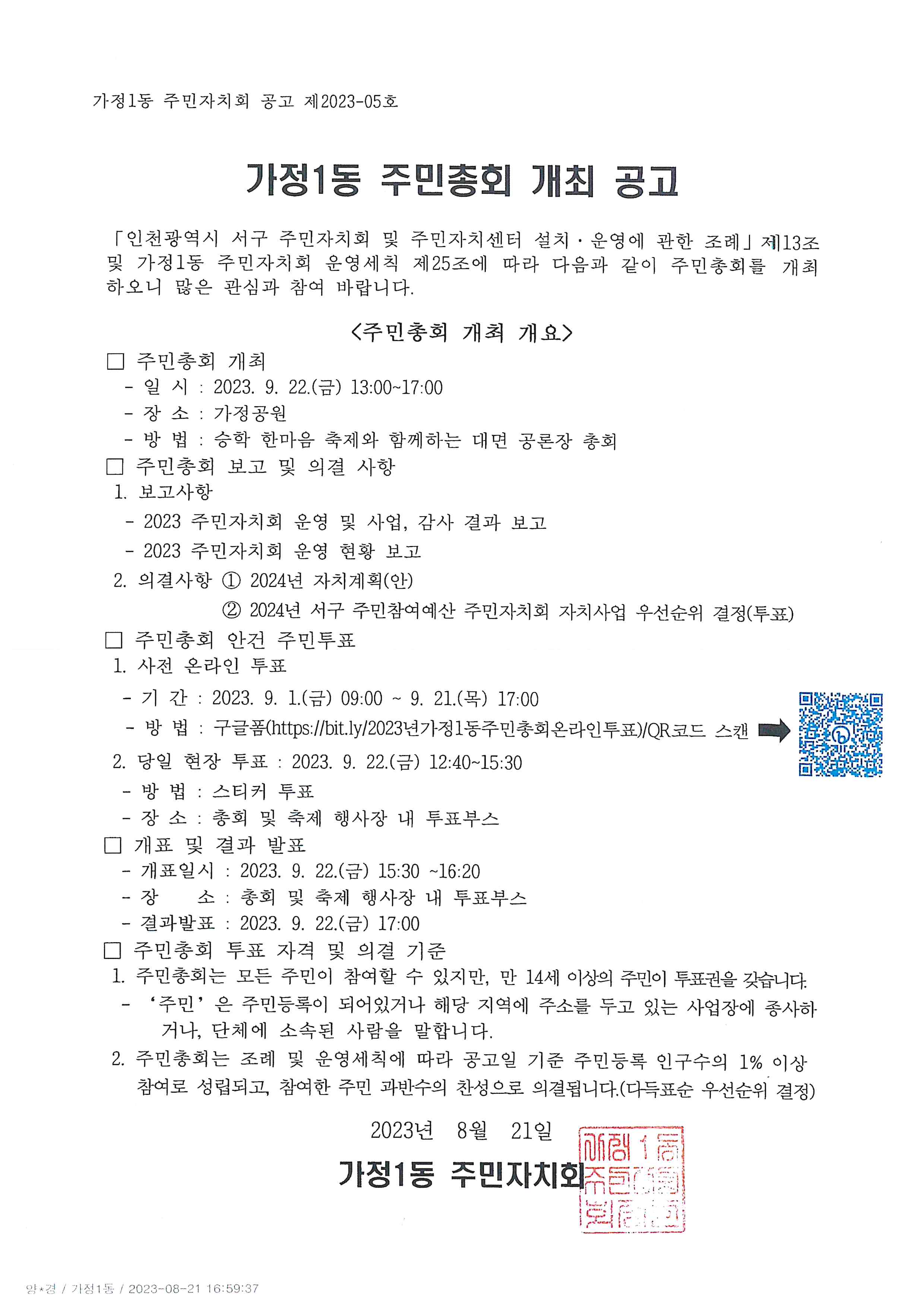 2023년 가정1동 주민총회를 공고와 같이 개최하고 , 총회 상정안건에 대하여 붙임과 같이 홍보하오니
