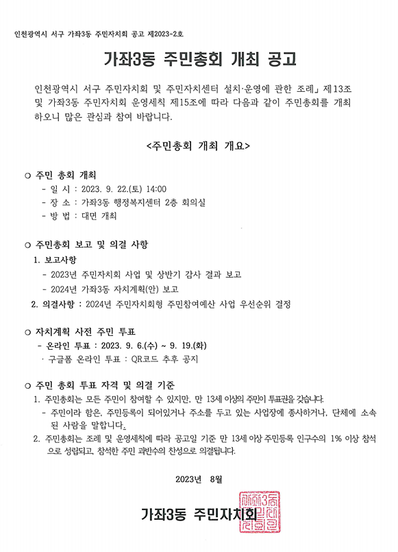 2023년 가좌3동 주민총회 개최 공고