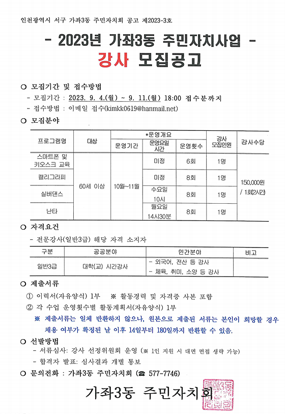 2023년 주민참여예산사업(가좌3동 어르신 대학) 강사 모집 공고