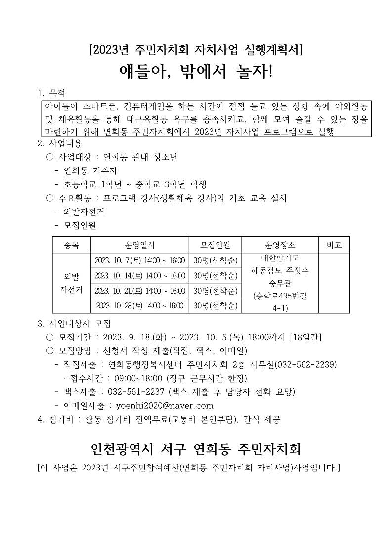 연희동 주민자치회 복지교육체육분과 자치사업 "얘들아, 밖에서 놀자!" (외발자전거) 신청 홍보