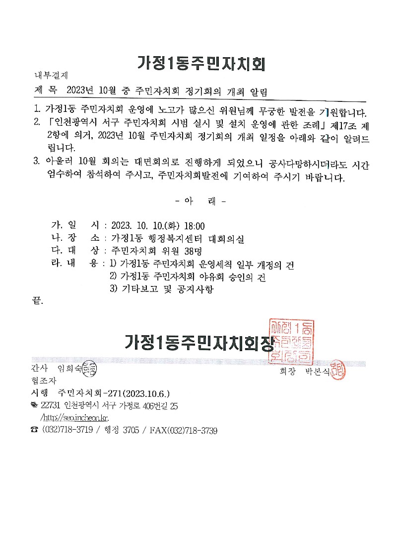 2023년 10월 가정1동 주민자치회 정기회의 개최 안내