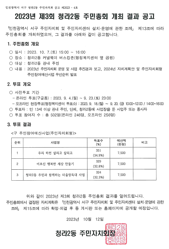 2023년 제3회 청라2동 주민총회 개최 결과 공고