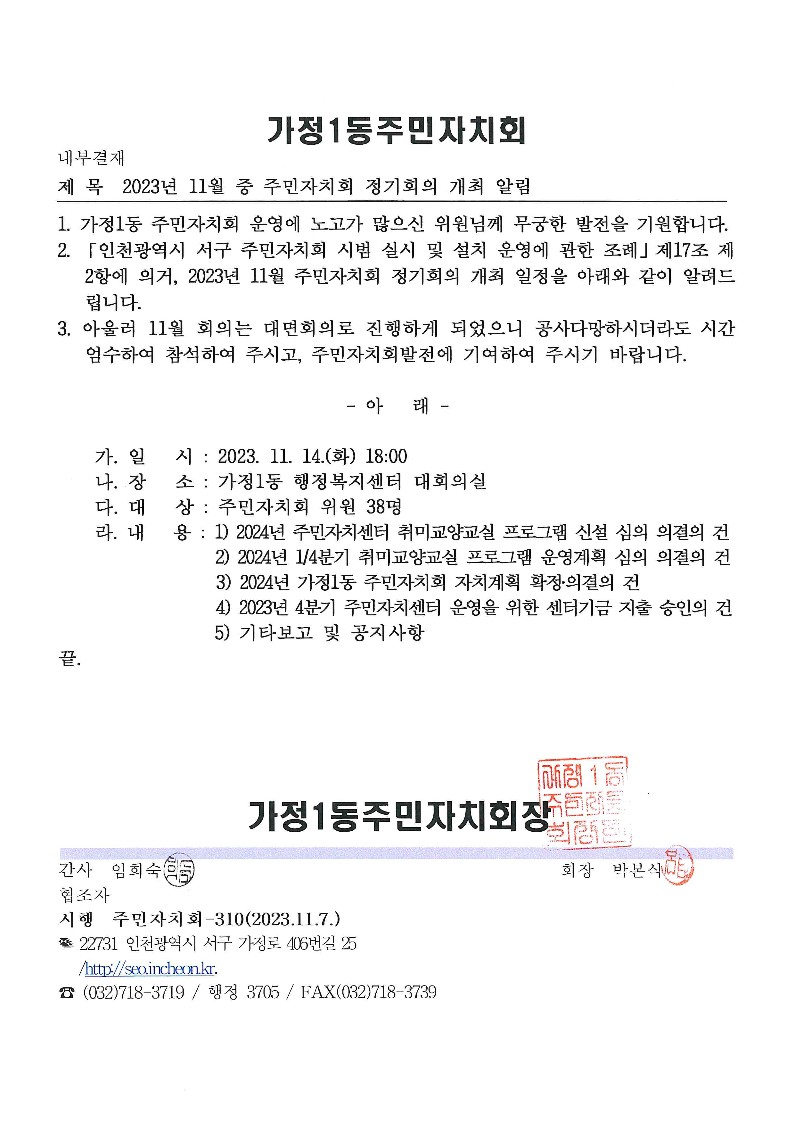 2023년 11월 가정1동 주민자치회 정기회의 개최 안내