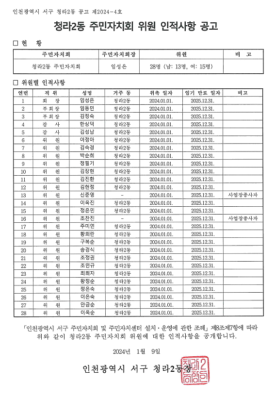 청라2동 주민자치회 2기 위원 인적사항 공고