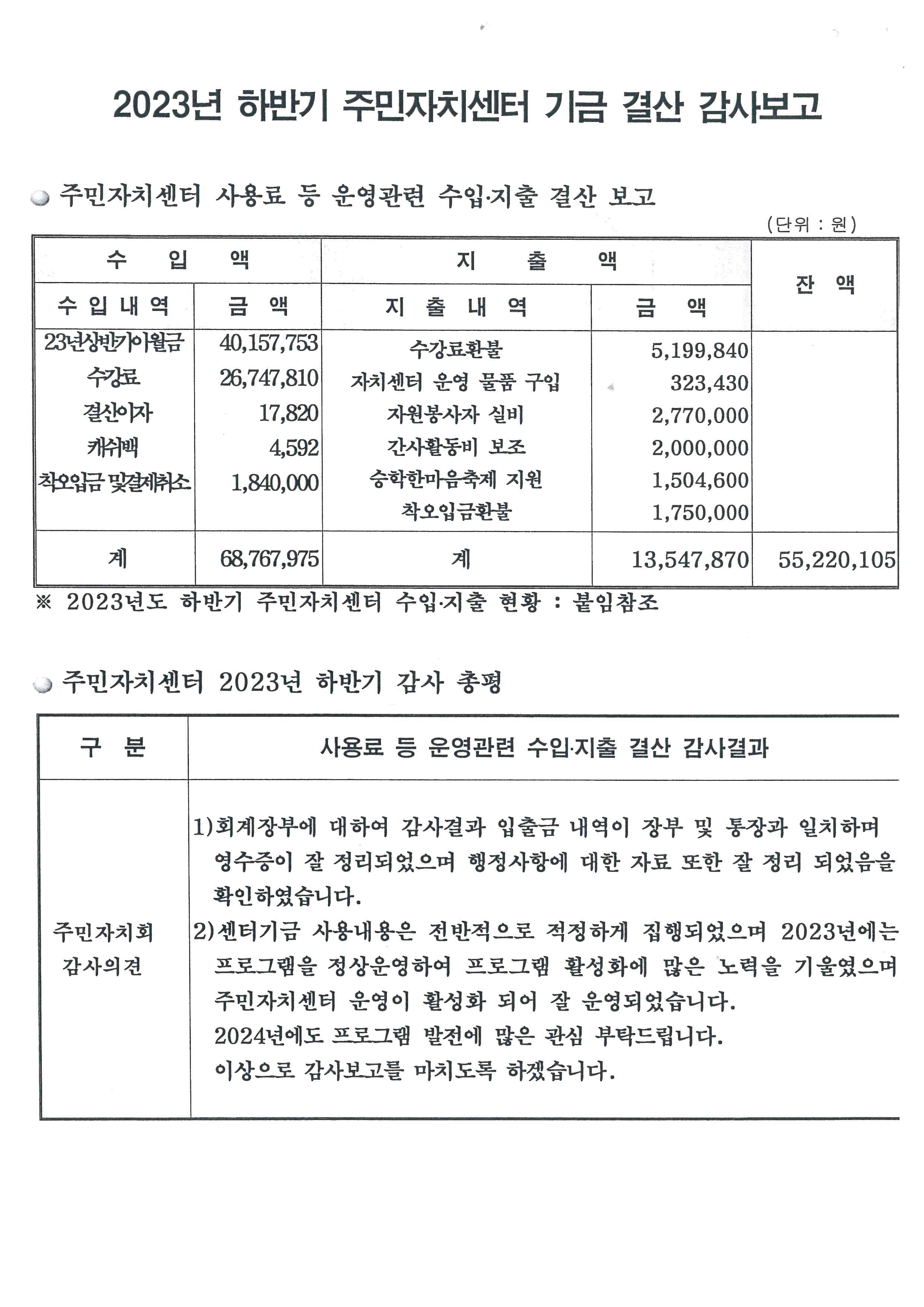 2023년 하반기 주민자치회 및 주민자치센터 회계·운영 전반에 대한 결산감사 결과를 붙임과 같이 공개합니다.