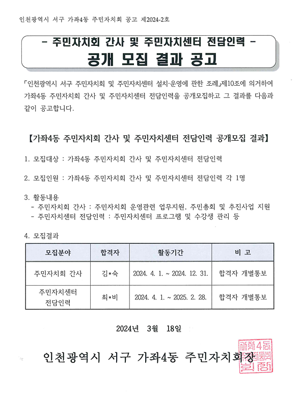 가좌4동 주민자치회 간사 및 주민자치센터 전담인력 공개 모집 결과 공고
