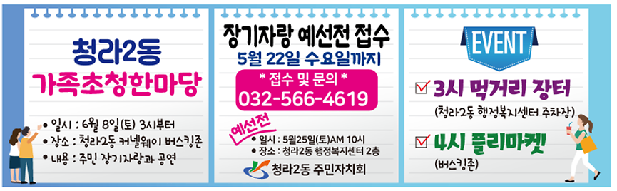 제2회 청라2동 가족초청한마당 장기자랑 예선접수가 위와 같으니 주민여러분의 많은 관심 바랍니다.