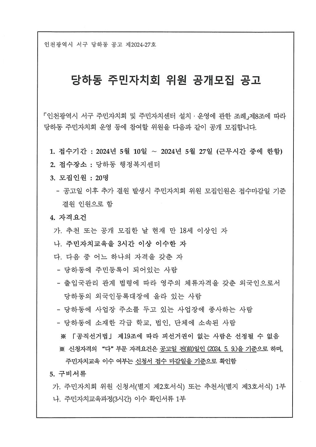 당하동 주민자치회 위원 공개모집 공고