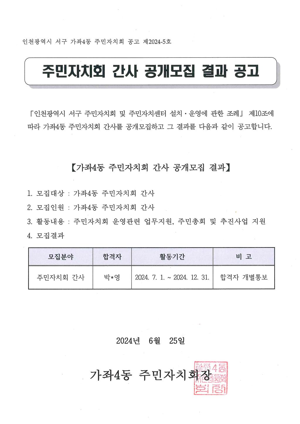 가좌4동 주민자치회 간사 공개모집 결과를 아래와 같이 공고합니다.