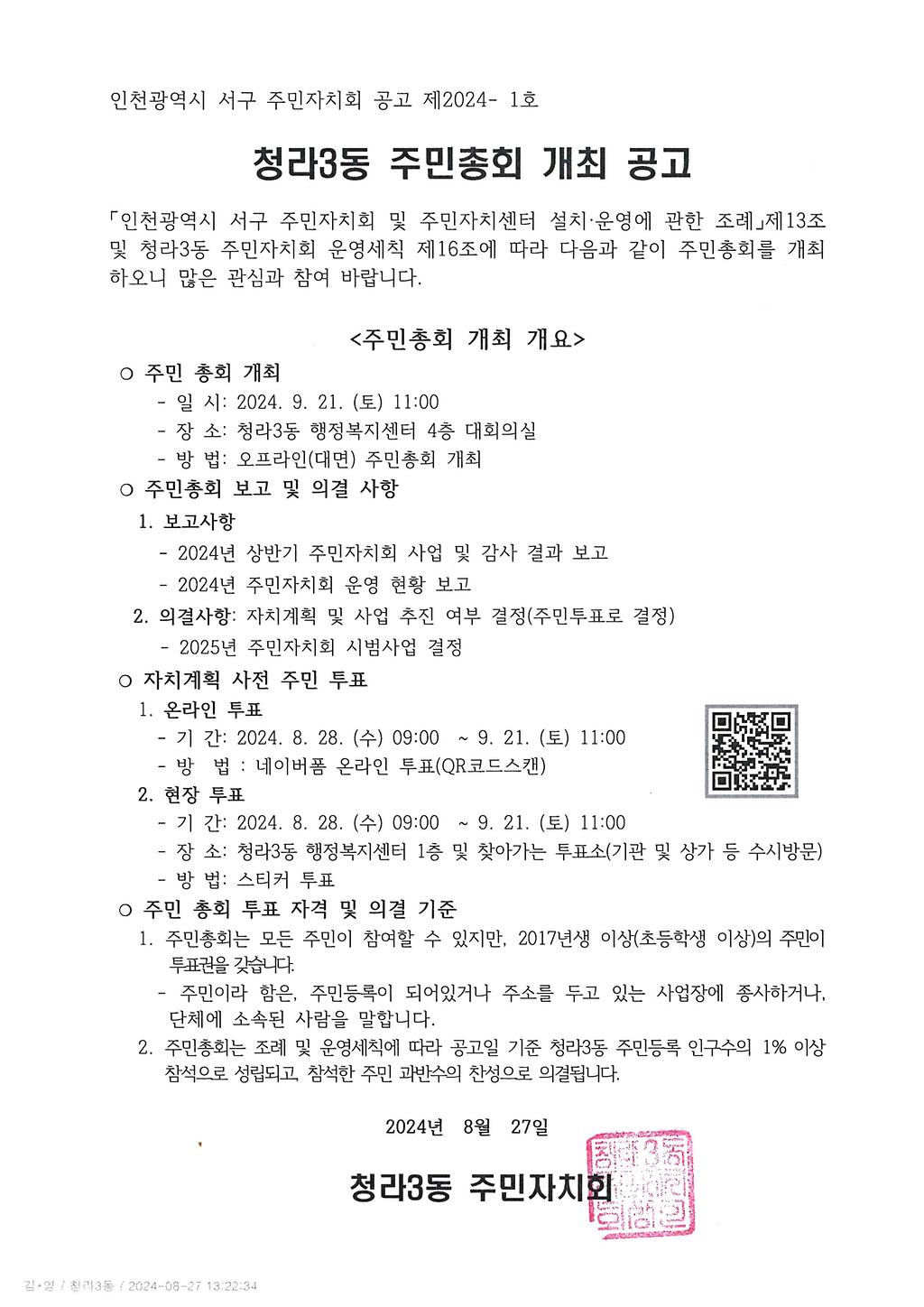 청라3동 주민자치회 주민총회 개최 공고