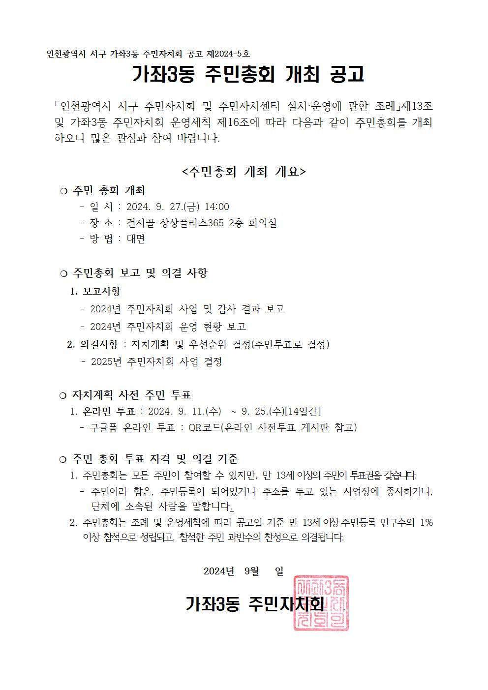 「인천광역시 서구 주민자치회 및 주민자치센터 설치.운영에 관한 조례」제13조 제3항에 의거 2024년 가좌3동 주민총회 개최를 공고합니다.