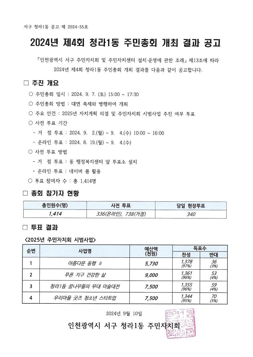 「인천광역시 서구 주민자치회 및 주민자치센터 설치·운영에 관한 조례」 제13조에 따라 2024년 제4회 청라1동 주민총회 개최 결과를 아래와 같이 공고하고자 합니다.