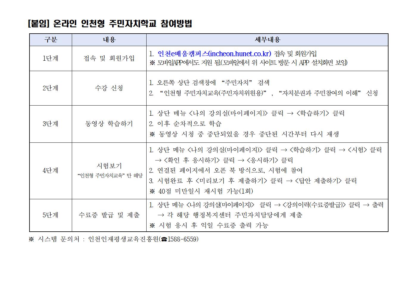 이에, 신규위원은 '인천형 주민자치교육(주민자치위원용)' 연임위원은 '자치분권과 주민참여의 이해'를 신청하여 수강하시면 됩니다.