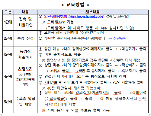 - 교육방법 : 인천e배움캠퍼스 회원가입 후 개별신청(모바일 가능)
