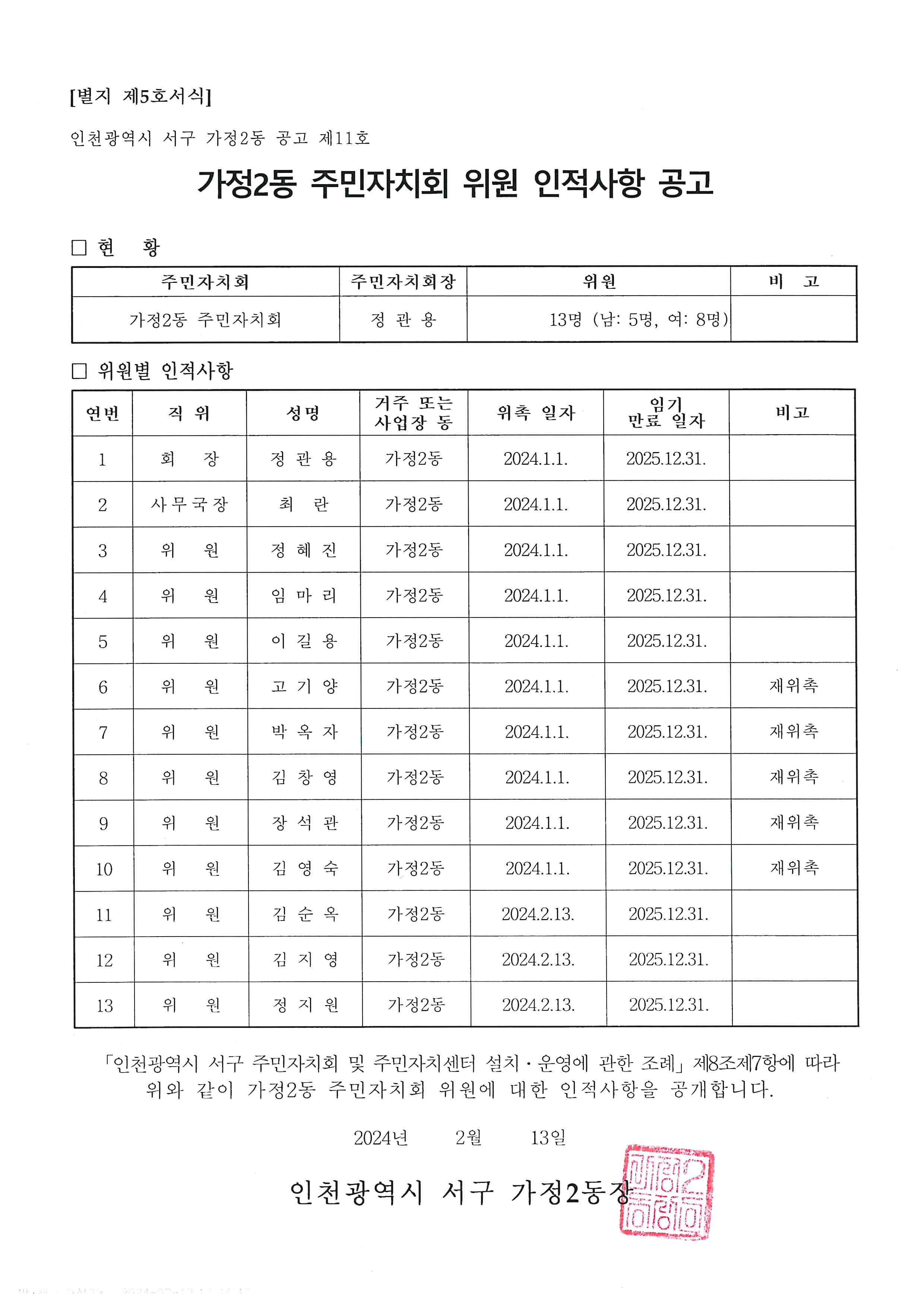 가정2동 주민자치회 위원 인적사항 공고