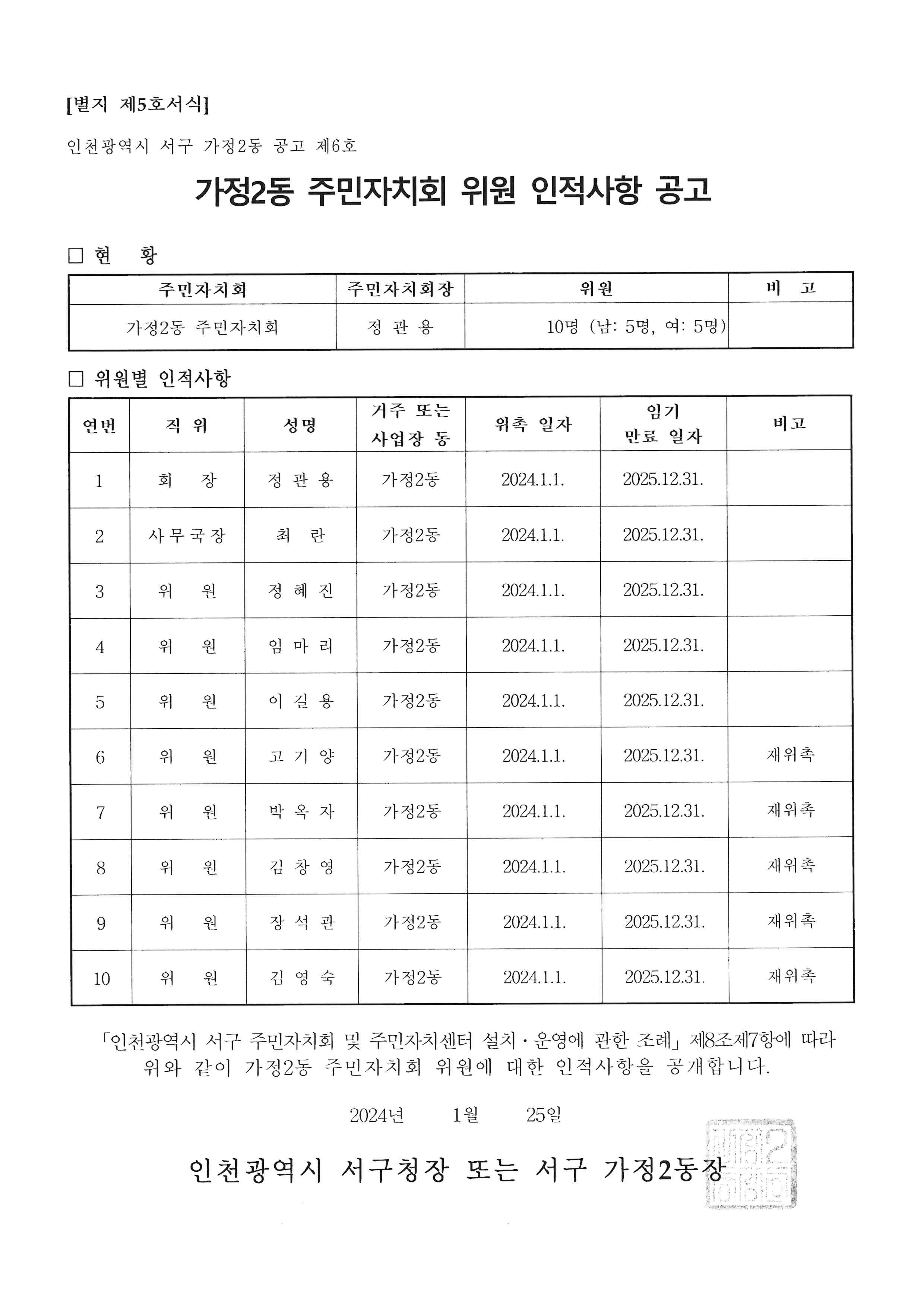 가정2동 주민자치회 위원 인적사항 공고