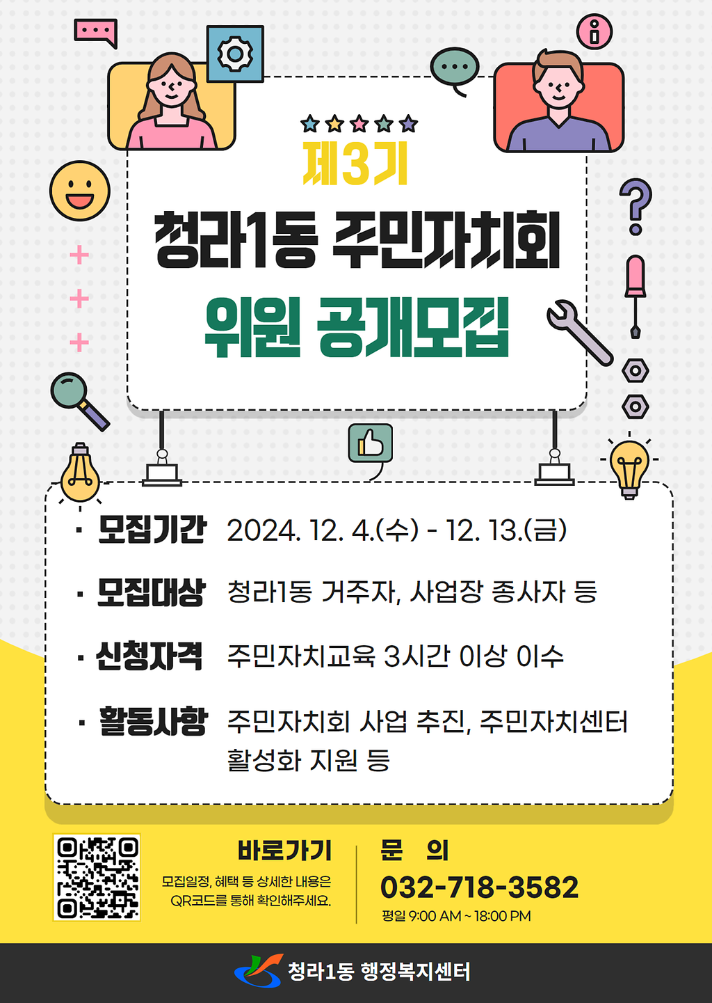 「인천광역시 서구 주민자치회 및 주민자치센터 설치·운영에 관한 조례」제8조 및 위원선정위원회 의결에 따라 청라1동 주민자치회 3기 위원 공개모집을 붙임과 같이 공고하고자 합니다.