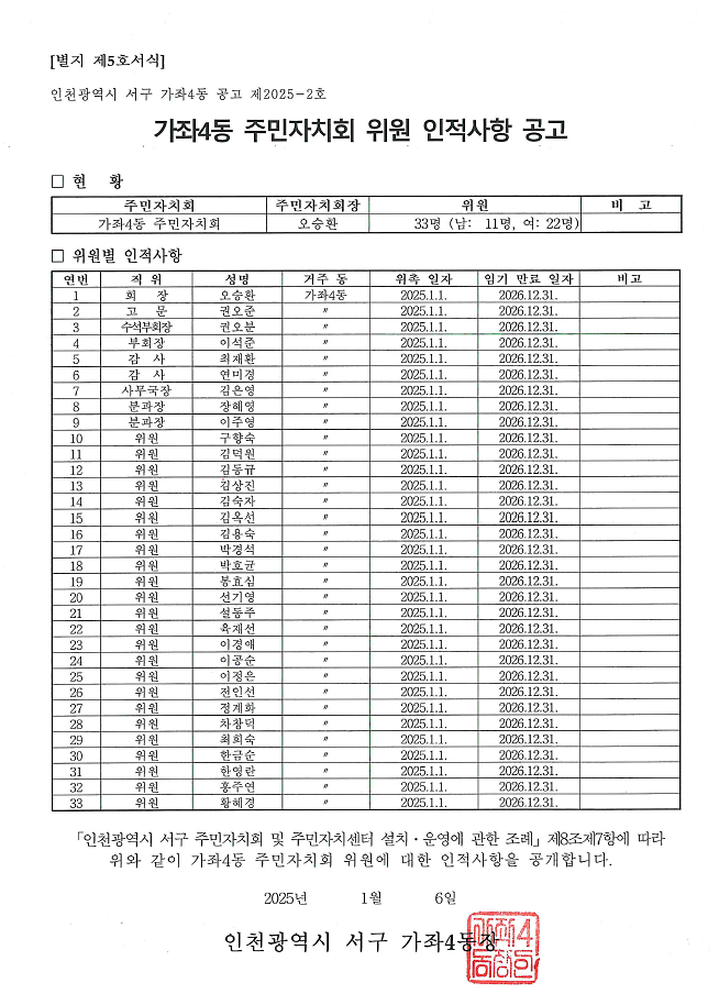 제3기 가좌4동 주민자치회 위원 인적사항 공고
