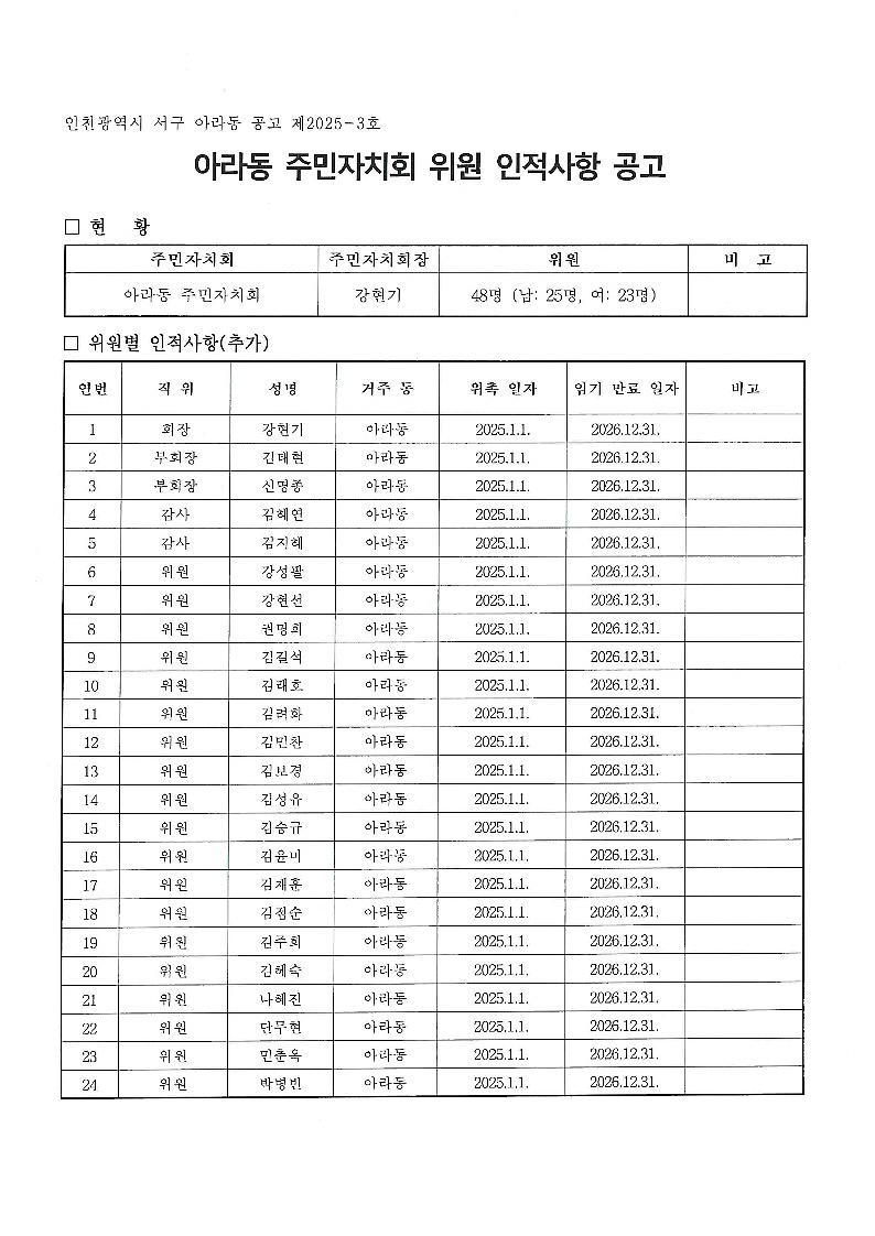 검암경서동 제3기 주민자치회 위원 인적사항 공고