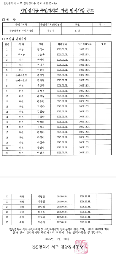 검암경서동 제3기 주민자치회 위원 인적사항 공고