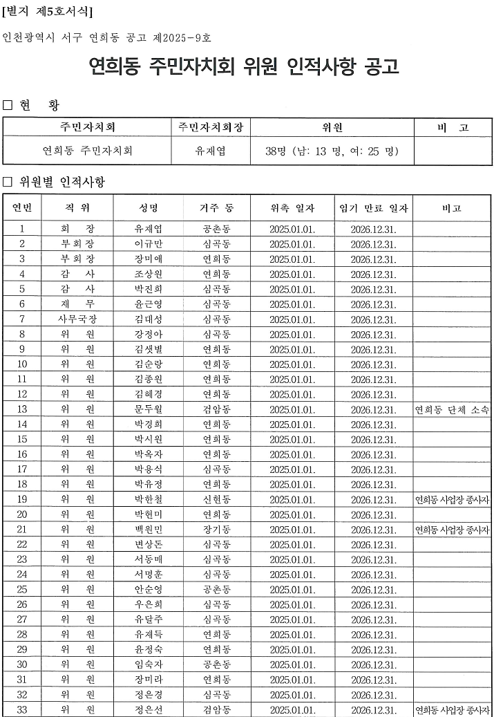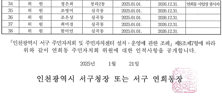 「인천광역시 서구 주민자치회 및 주민자치센터 설치 · 운영에 관한 조례」제8조 제7항 및 같은조례 시행규칙 제6조 및 제10조에 따라 아래와 같이 연희동 주민자치회 위원에 대한 인적사항을 공개합니다.