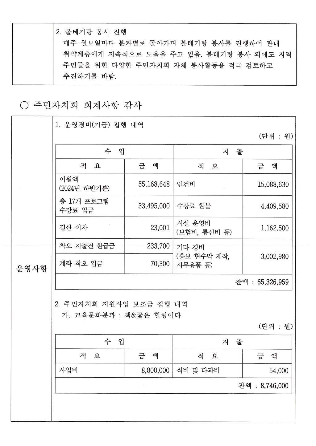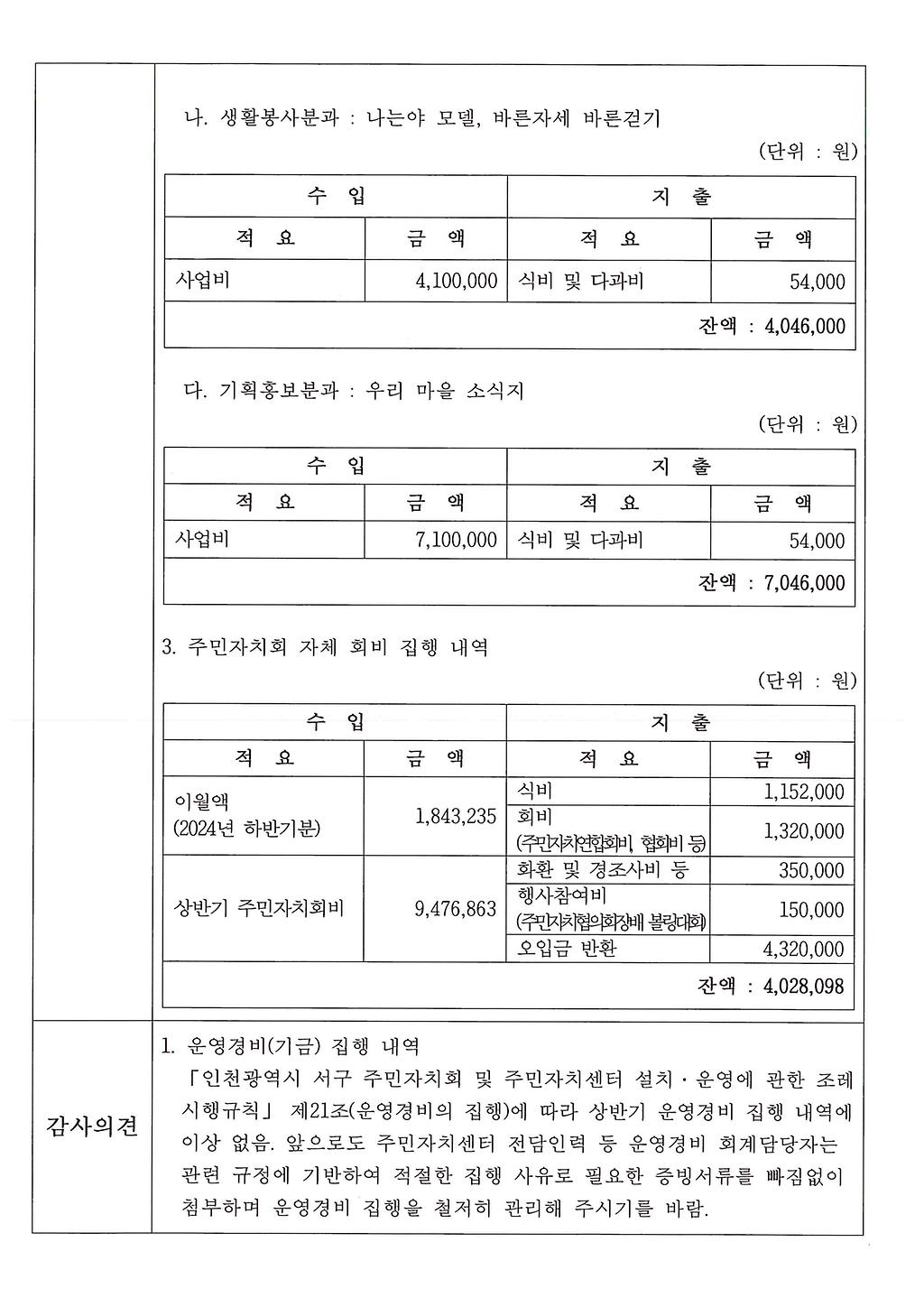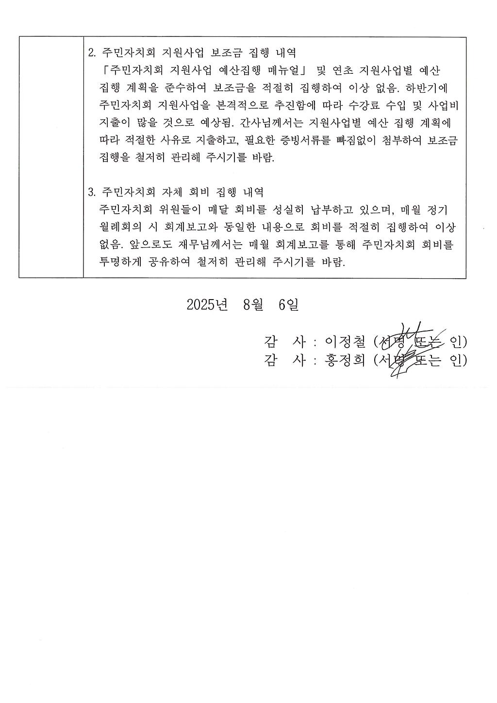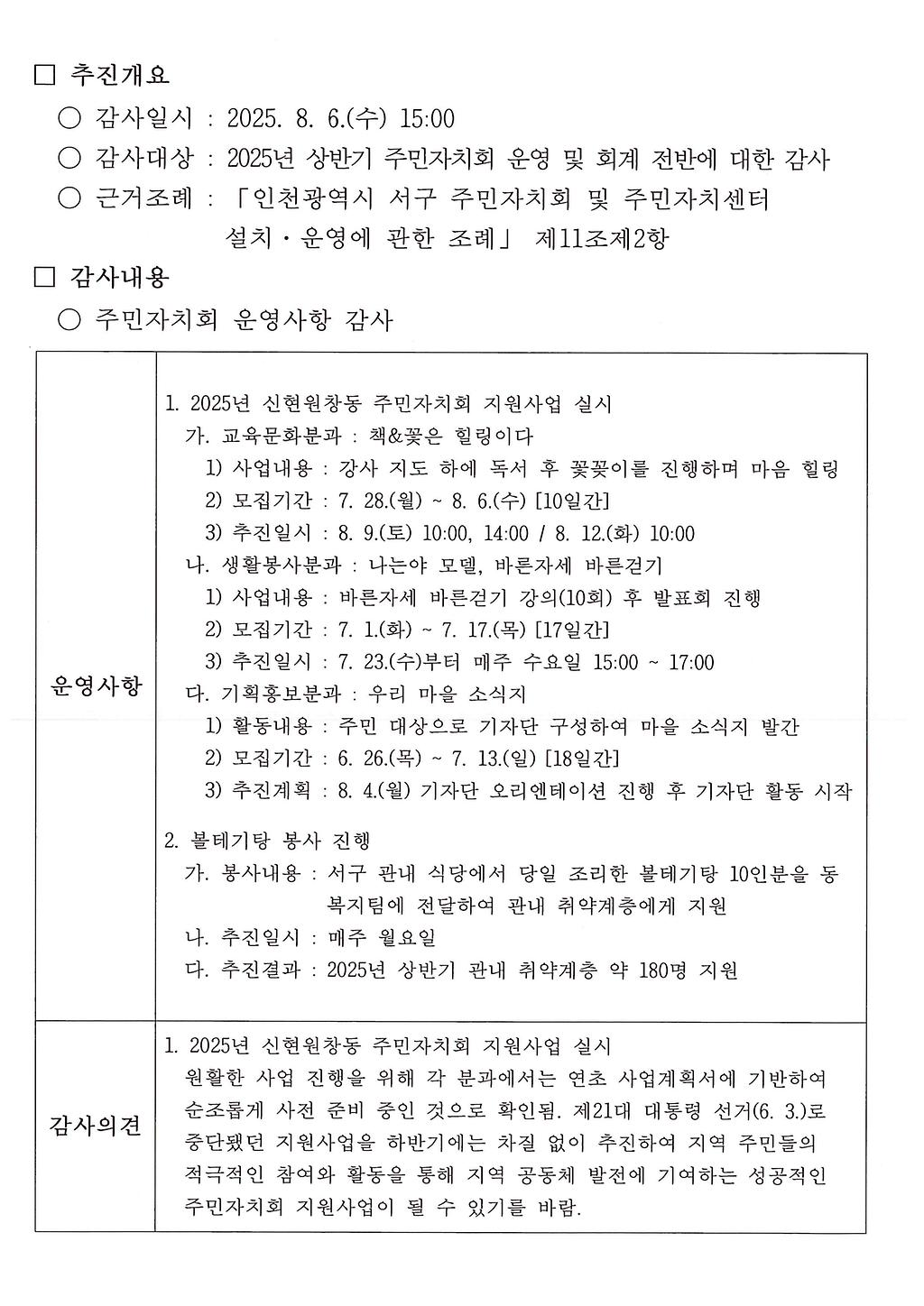 2025년 상반기 신현원창동 주민자치회 자체 감사를 실시하고 그 결과를 아래와 같이 공개합니다.