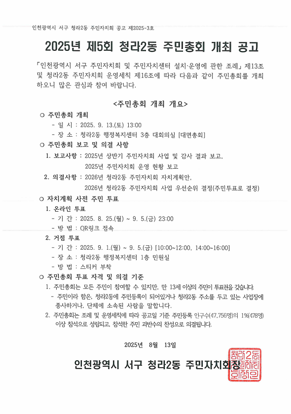 2025년 제5회 청라2동 주민총회 개최 공고