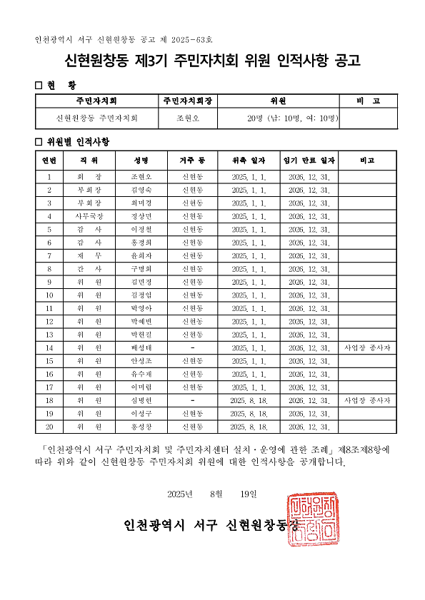 같은 조례 시행규칙 제6조 및 제10조에 따라 공개모집한 신현원창동 제3기 주민자치회 위원 인적사항을 아래와 같이 공고하고자 합니다.