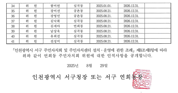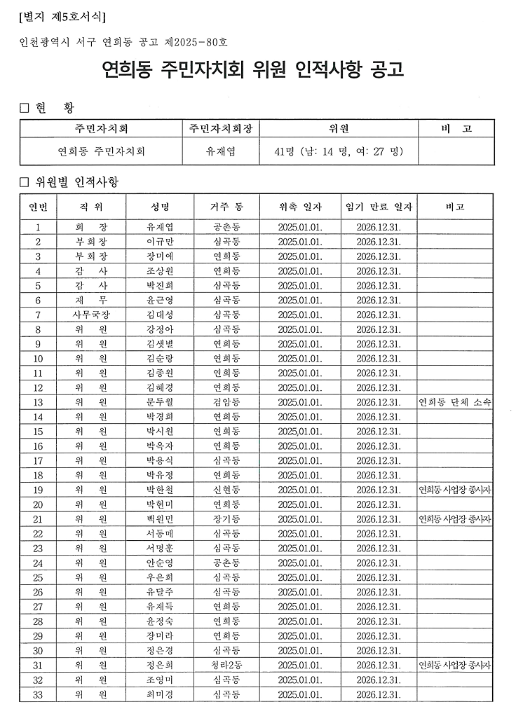 연희동 주민자치회 위원 인적사항 공고(2025.8.21.기준)