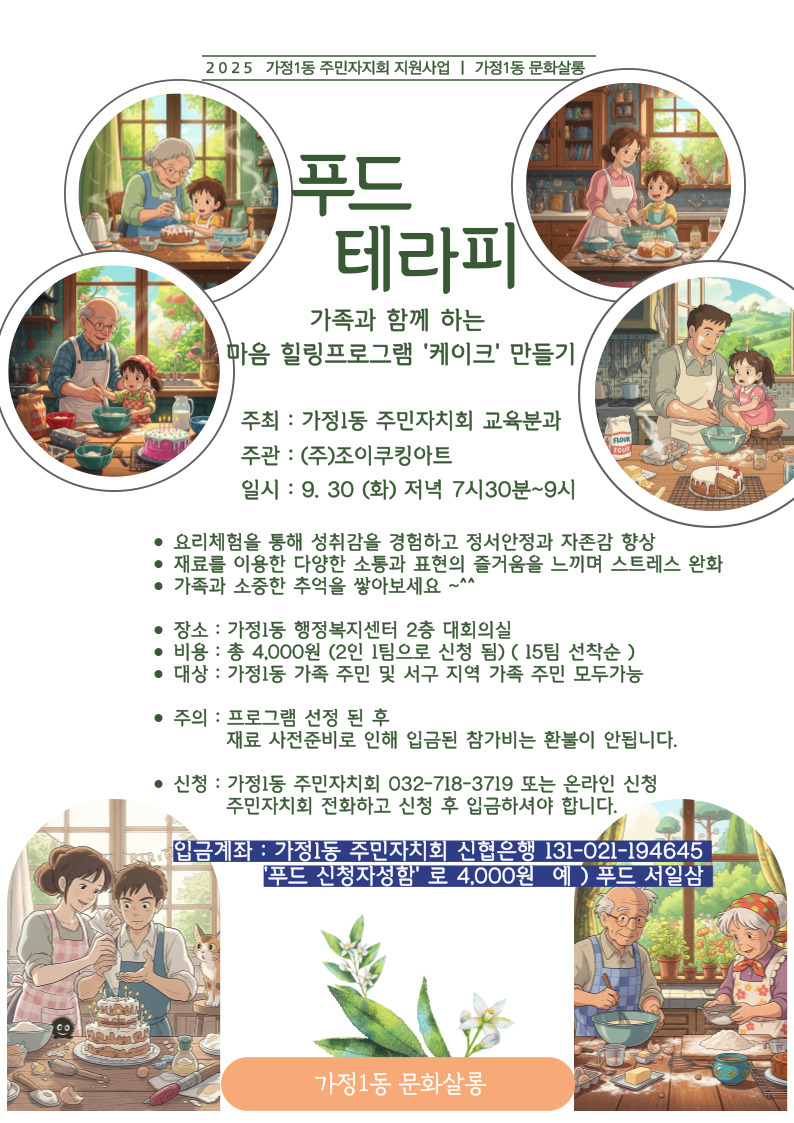 네이버 폼 신청 : http://naver.me/FBaf0DvF 또는 032-718-3719 전화 신청 후 참가비 입금<계좌 : 신협은행 131-021-194645(가정1동 주민자치회)>