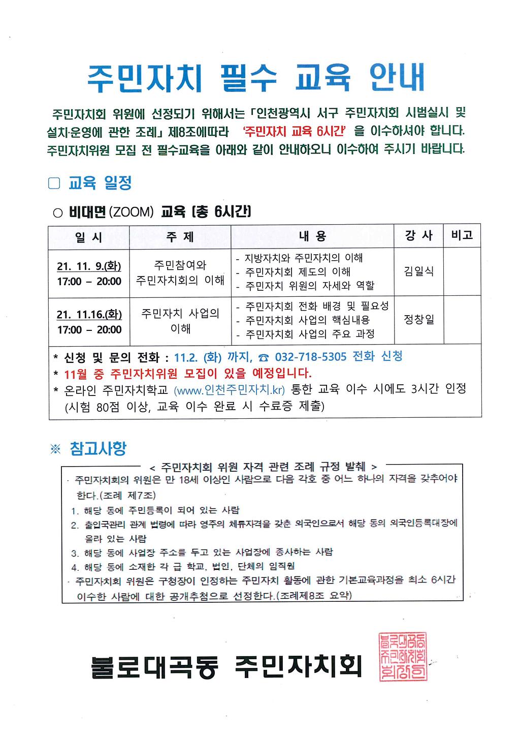 주민자치회 위원이 되기위한 기본 교육이 11월 9일, 11월 16일 있으니