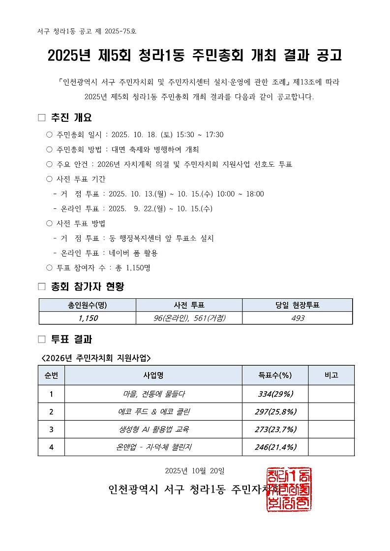 「인천광역시 서구 주민자치회 및 주민자치센터 설치·운영에 관한 조례」제13조에 따라 2025년 제5회 청라1동 주민총회 개최 결과를 위와 같이 공고합니다.