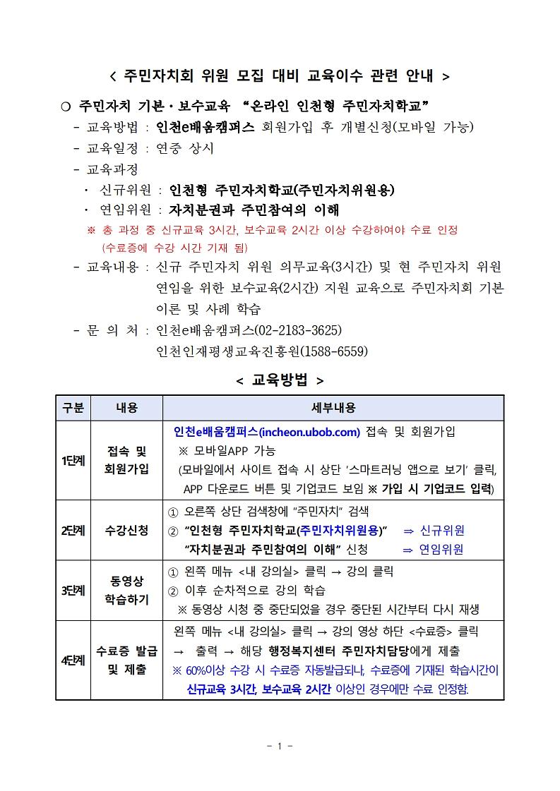신규위원의 경우 '인천형 주민자치학교(3시간)', 연임위원의 경우 '자치분권과 주민참여의 이해(2시간)' 교육이수가 필요합니다.