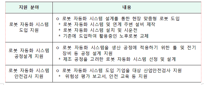 ◦ 제조공정 로봇 도입, 공정설계 컨설팅, 안전 검사 등 패키지 지원