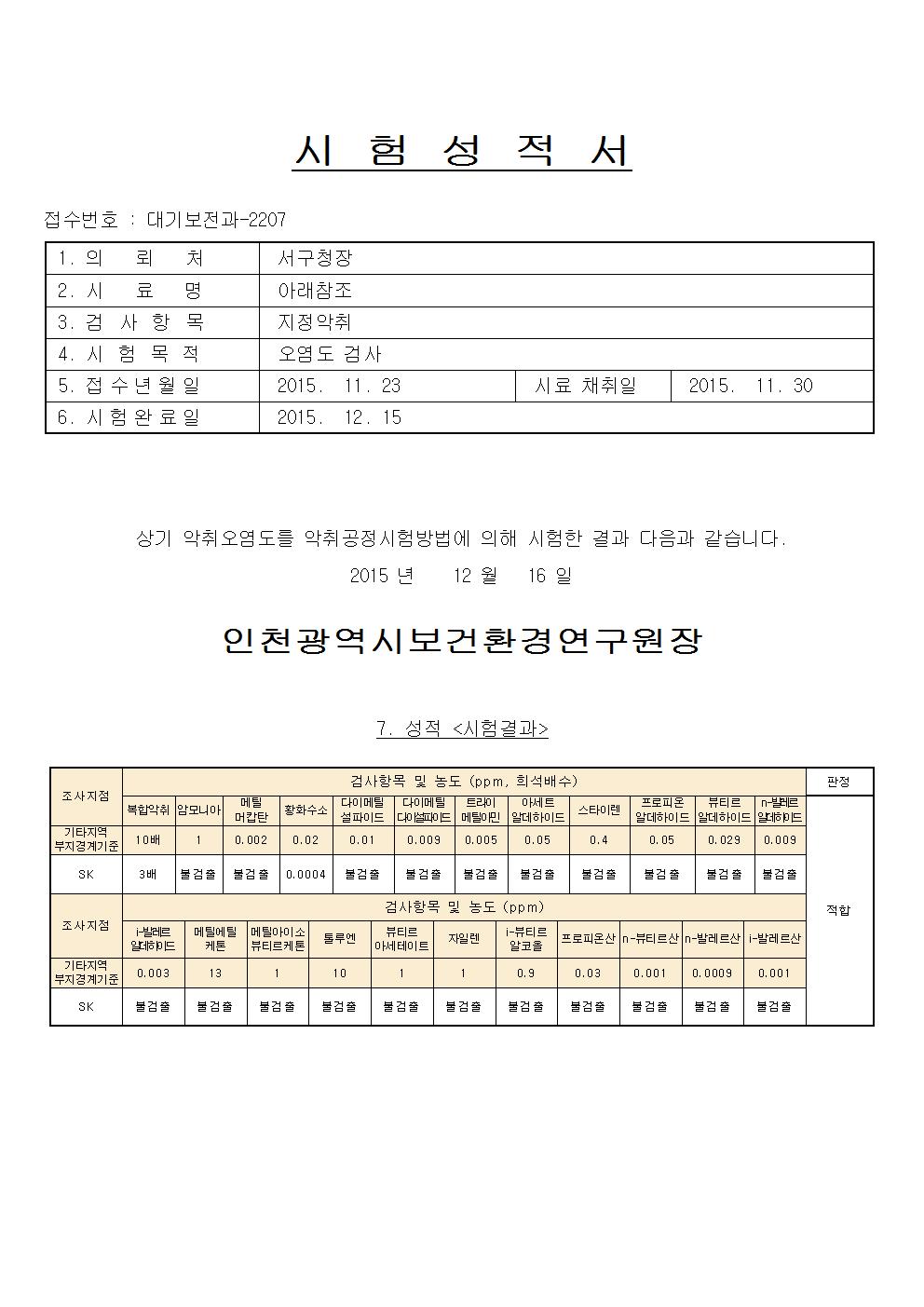 SK인천석유화학 복합 및 지정악취 검사결과를 붙임과 같이 알려드립니다. 끝.
