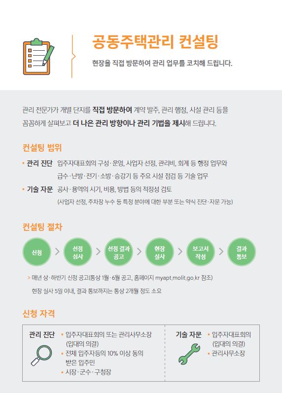 「공동주택 관리상태 진단, 공사ㆍ용역의 타당성 자문 등 기술지원」 서비스를 제공하고 있습니다.