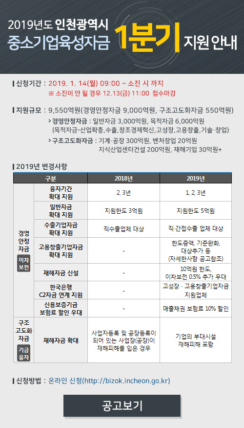 2019년도 인천광역시 중소기업육성자금 1분기 지원계획을 붙임과 같이 안내하오니,