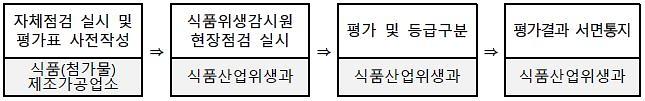 관내 식품제조가공업소 및 식품첨가물제조업소의 위생 및 품질관리능력을 평가하여 출입·검사의 효율성을 제고하고자 위생관리등급제를 실시할 예정이오니 평가에 적극 협조하여 주시기 바랍니다.
