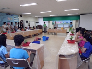 검단2동 주민자치위원회에서는 불로초교에서 학부모회 지원사업의 일환으로 실시하고 있는 우리 아이 함께 키우기 사업과 연계한 지역공동체 사업을 추진하였습니다. 지난 8월25일에는 아이들과 함께 PET병을 재활용한 공기정화 식물 수경재배 화분만들기 무료강좌를 실시하였습니다.