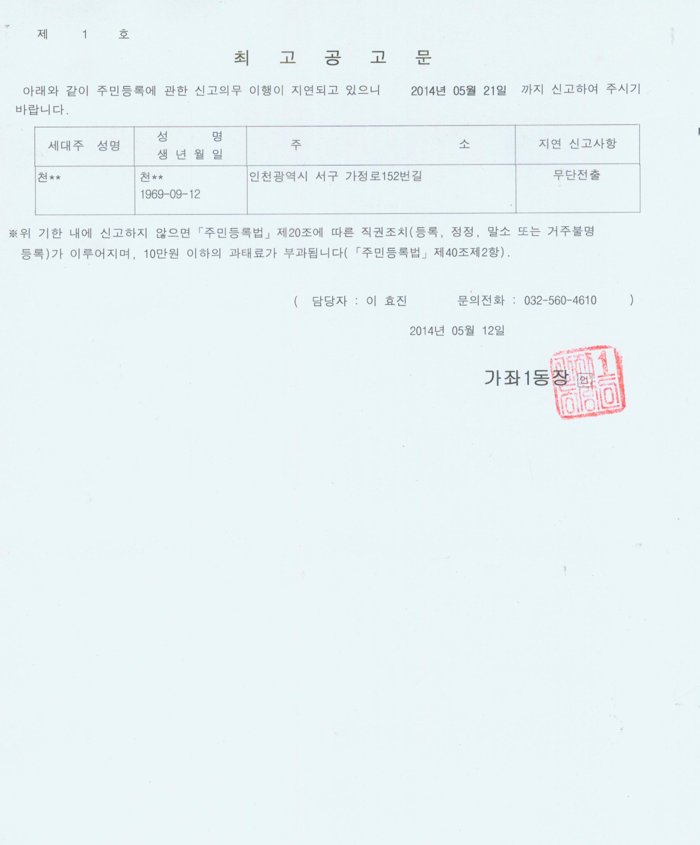 「주민등록법」 제 20조 및 동법 시행령 제 28조의 규정에 의거 무단전출자에 대하여 공고코자 합니다.
