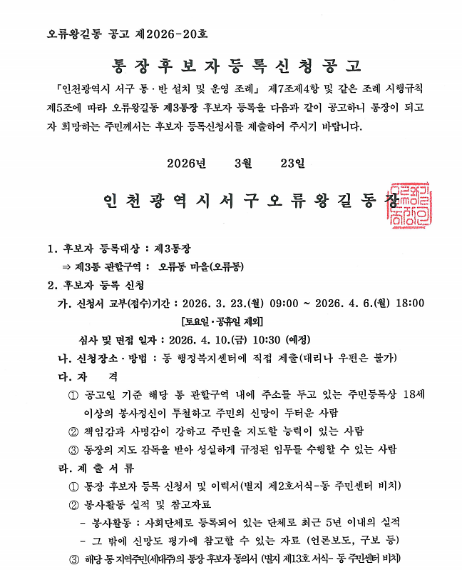 오류왕길동 제3통장 공개모집 재공고