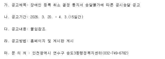 장애인 등록 취소 결정 통지서 송달불가에 따른 공시송달 공고