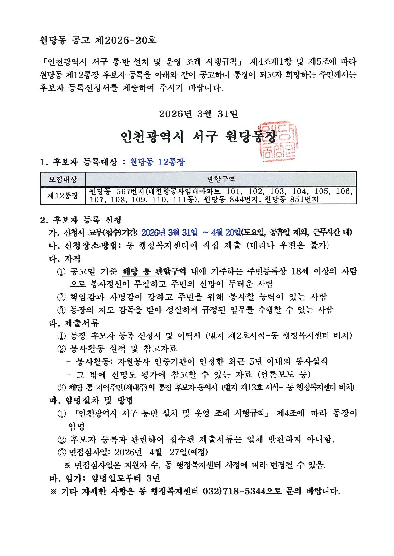원당동 12통장 후보자 등록을 아래와 같이 공고하오니