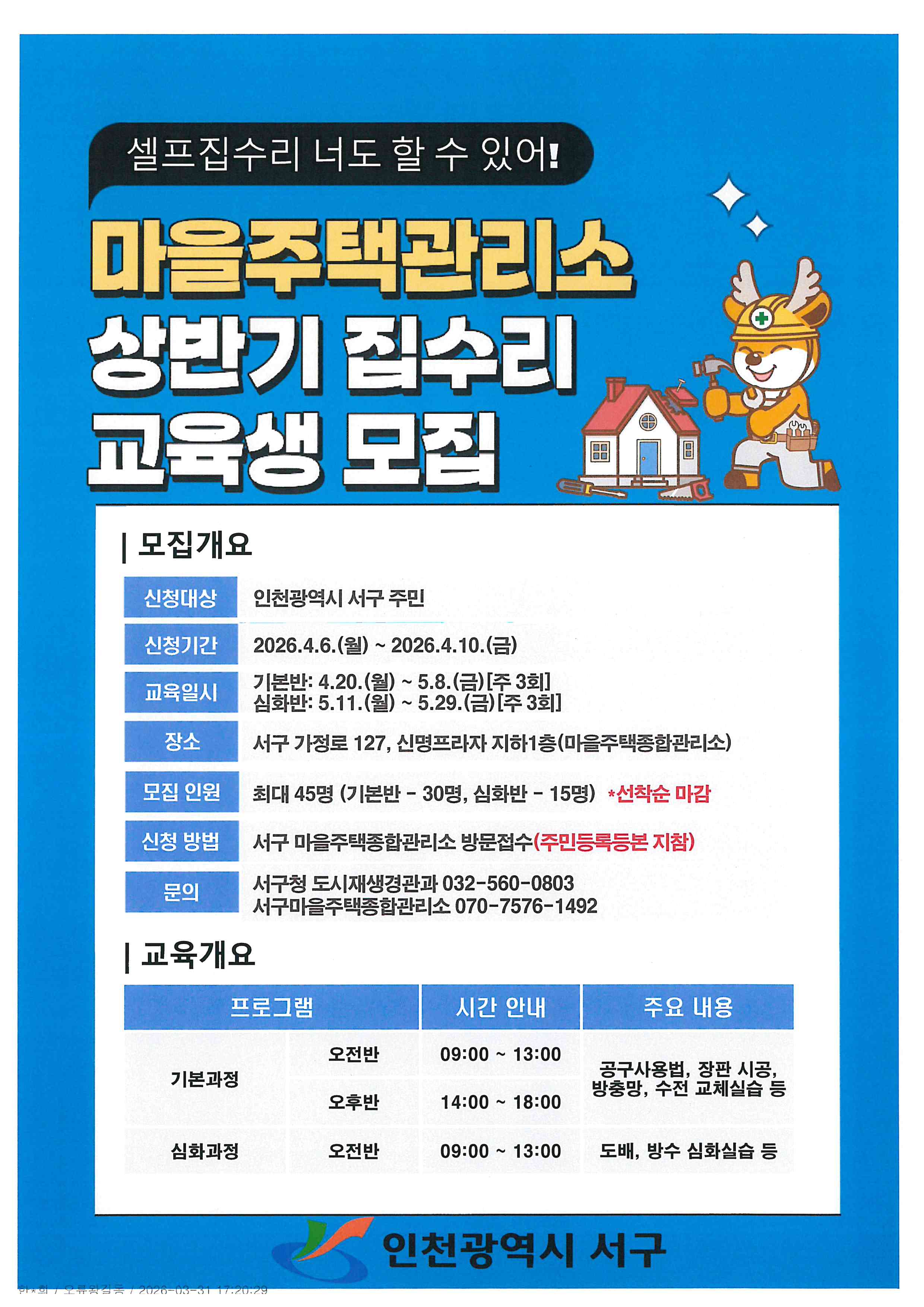 2026년도 마을주택관리소 상반기 집수리 교육생 모집