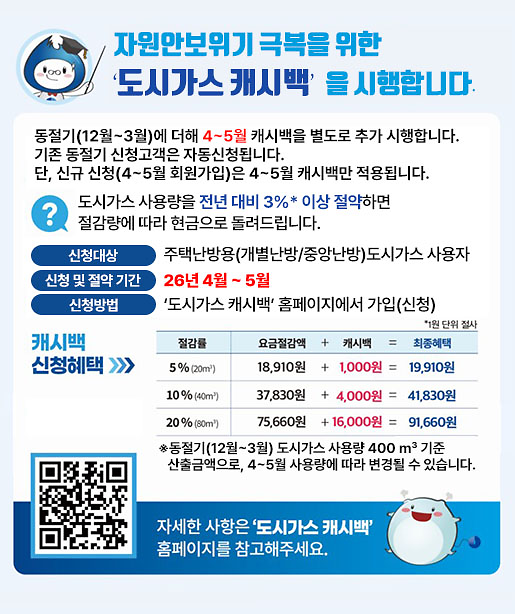 도시가스 절약 캐시백 추가시행('26.4.~5.) 안내