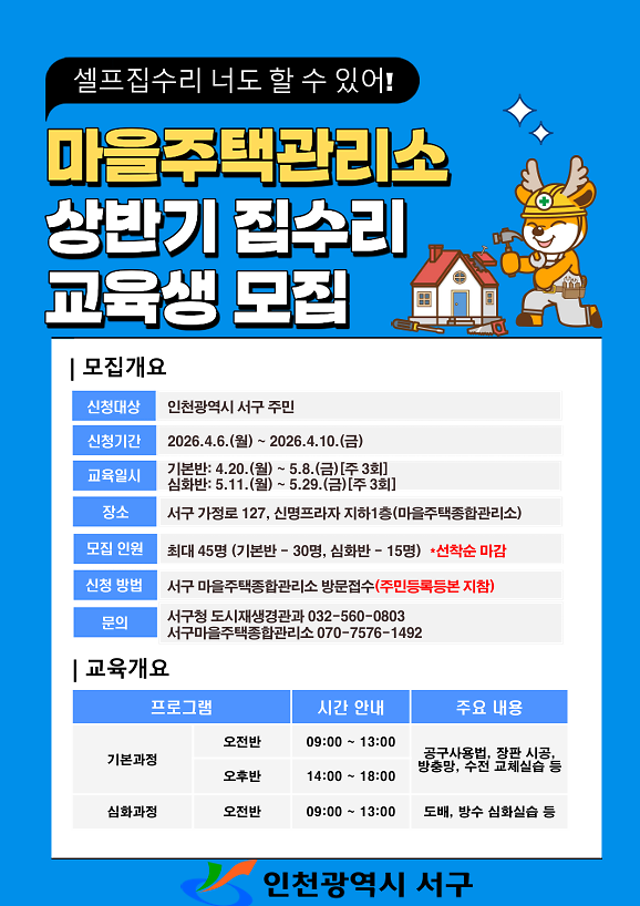 2026년 마을주택관리소 상반기 집수리 교육생 모집 안내