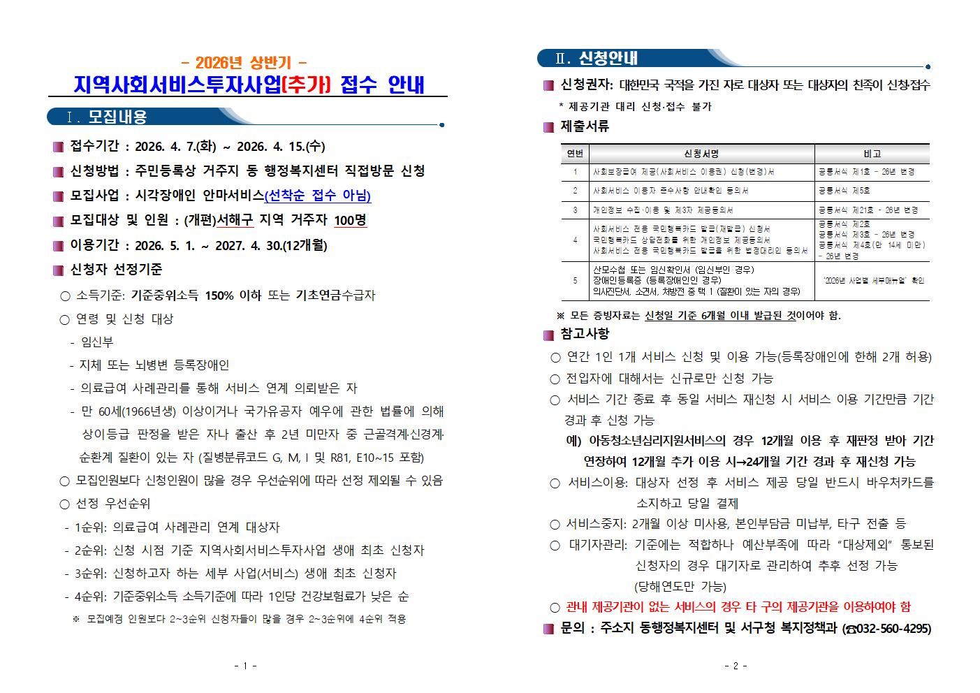 2026년도 상반기 지역사회서비스투자사업 추가 접수 안내 (시각장애인안마서비스)