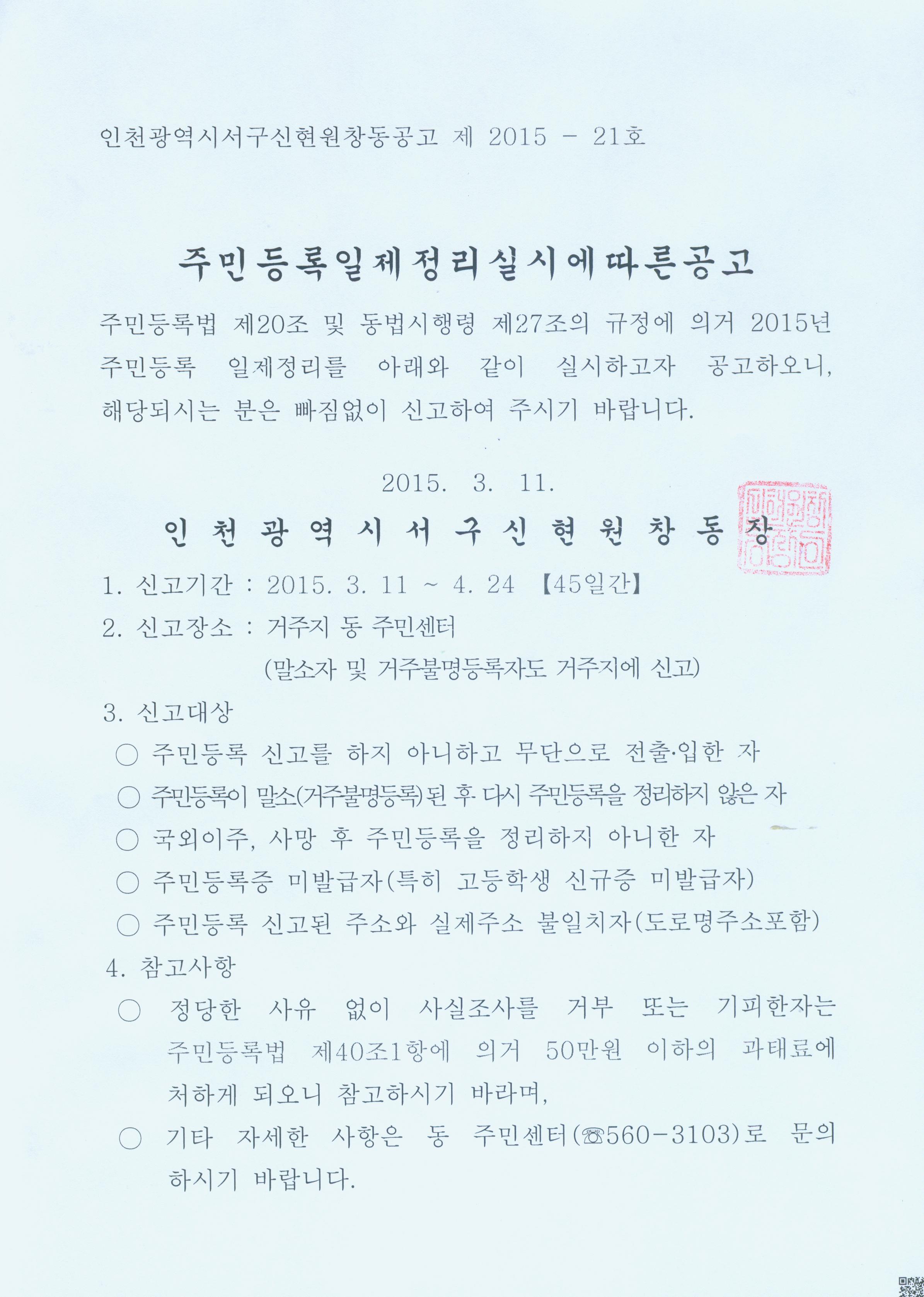 주민등록법 제20조 및 동법 시행령 제27조의 규정에 의거하여 2015년 주민등록 일제정리 실시를 위해 아래와 같이 공고하고자 합니다.