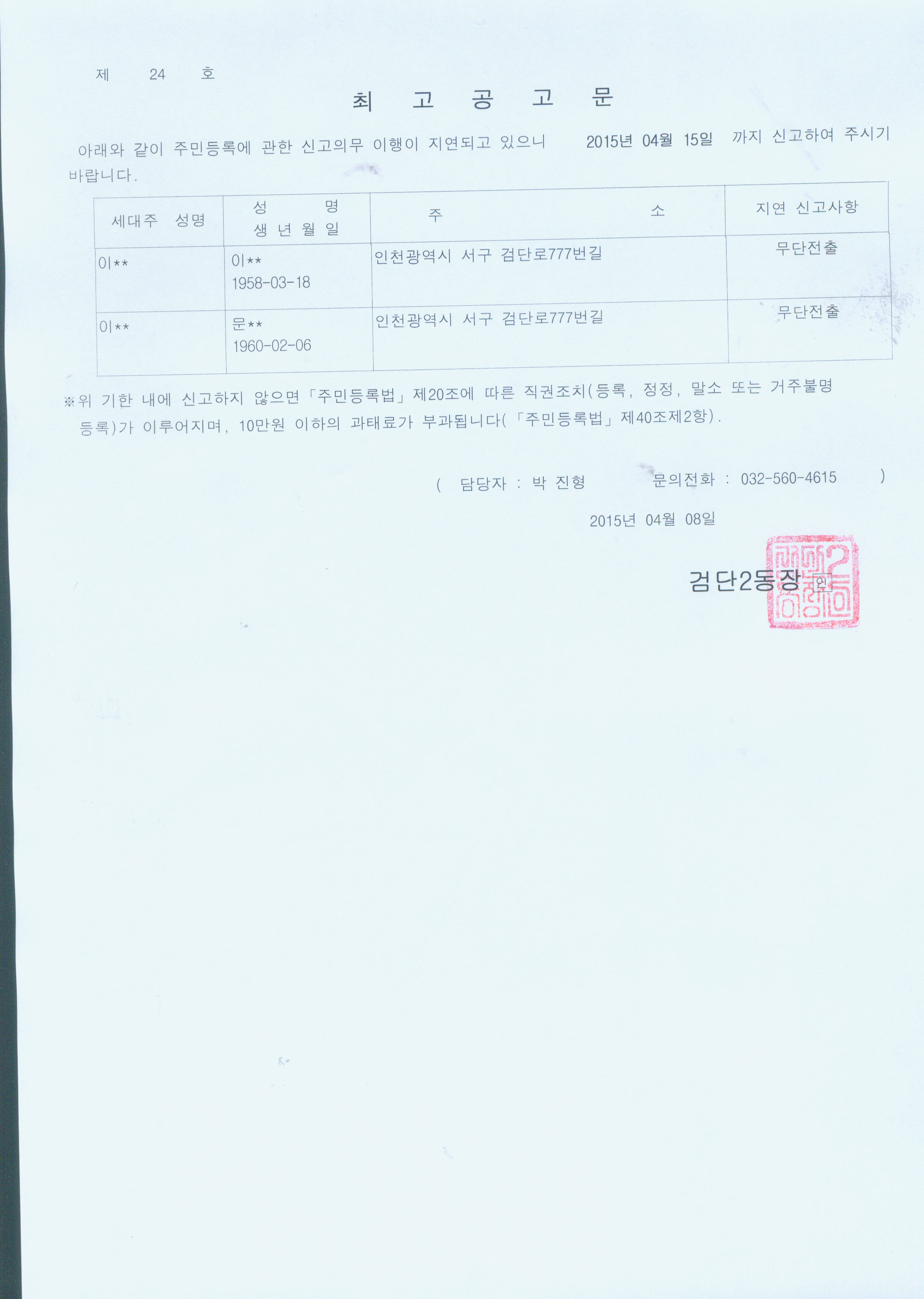 주민등록 무단전출자에 대해 주민등록법 제20조 및 동법 시행령 제28조 규정에 의거